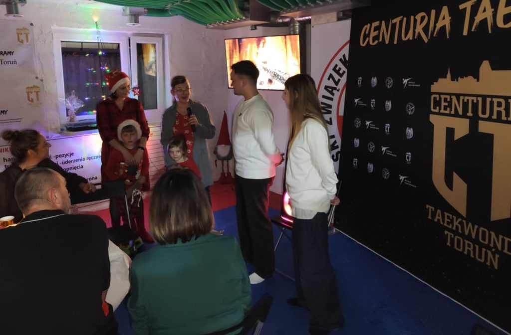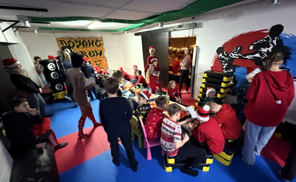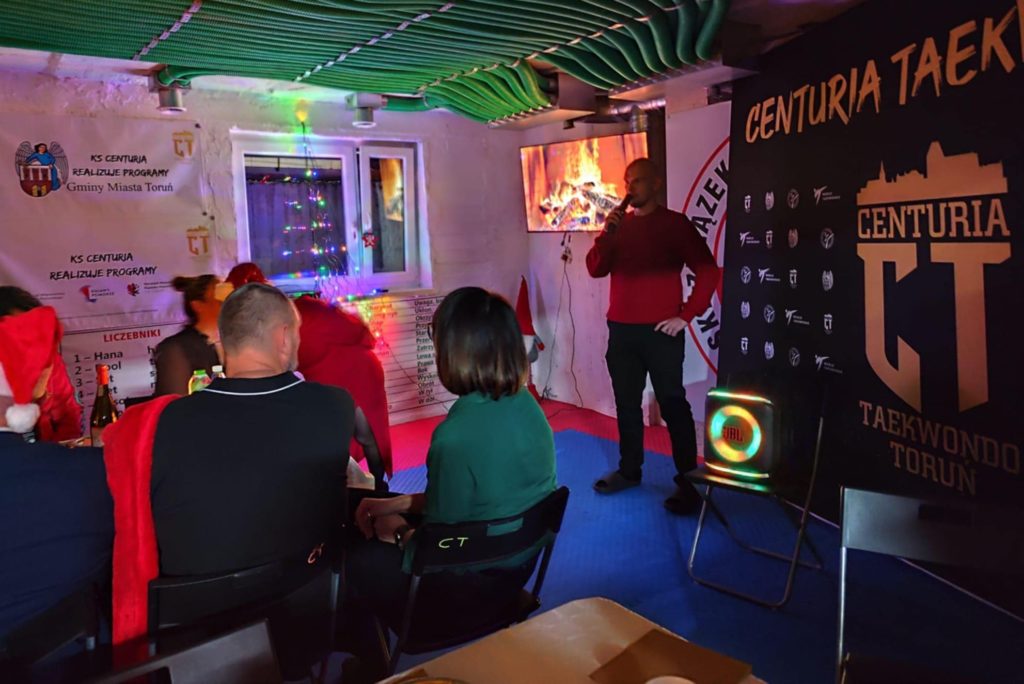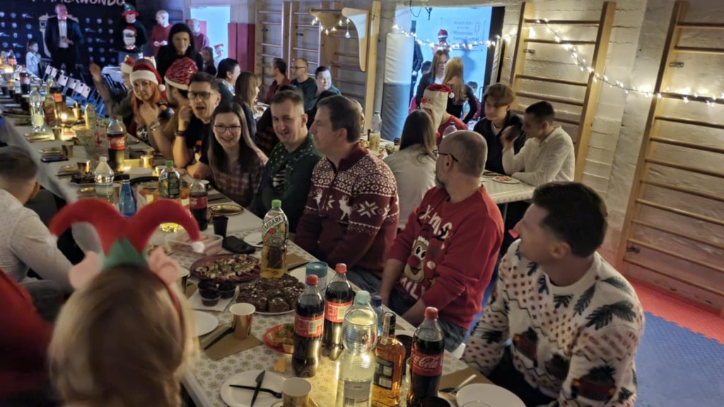 Na naszej sali odbyło się kolejne Spotkanie Świąteczne. W tym roku przewinęła się rekordowa liczba dzieci i rodziców, których ze względu na nadkomplet nie udało się sfotografować wszystkich jednocześnie. Na samej dużej części sali przygotowano ok. 100 miejsc siedzących, a była jeszcze mniejsza, gdzie biegały dziesiątki dzieci z najmłodszych grup. Panowała przyjemna, rodzinna atmosfera. Organizację wziął na siebie klub oraz rodzice, którym dziękujemy za super prezenty, przyniesienie jedzenia na wspólny stół, pomoc w przygotowaniu i posprzątaniu dojang. Dziękujemy za słowa od zawodników, rodziców. Był czas na podsumowania, rozmowy i życzenia. Wszystkie dzieciaki otrzymały prezenty z dobrej jakości gadżetami klubowymi.